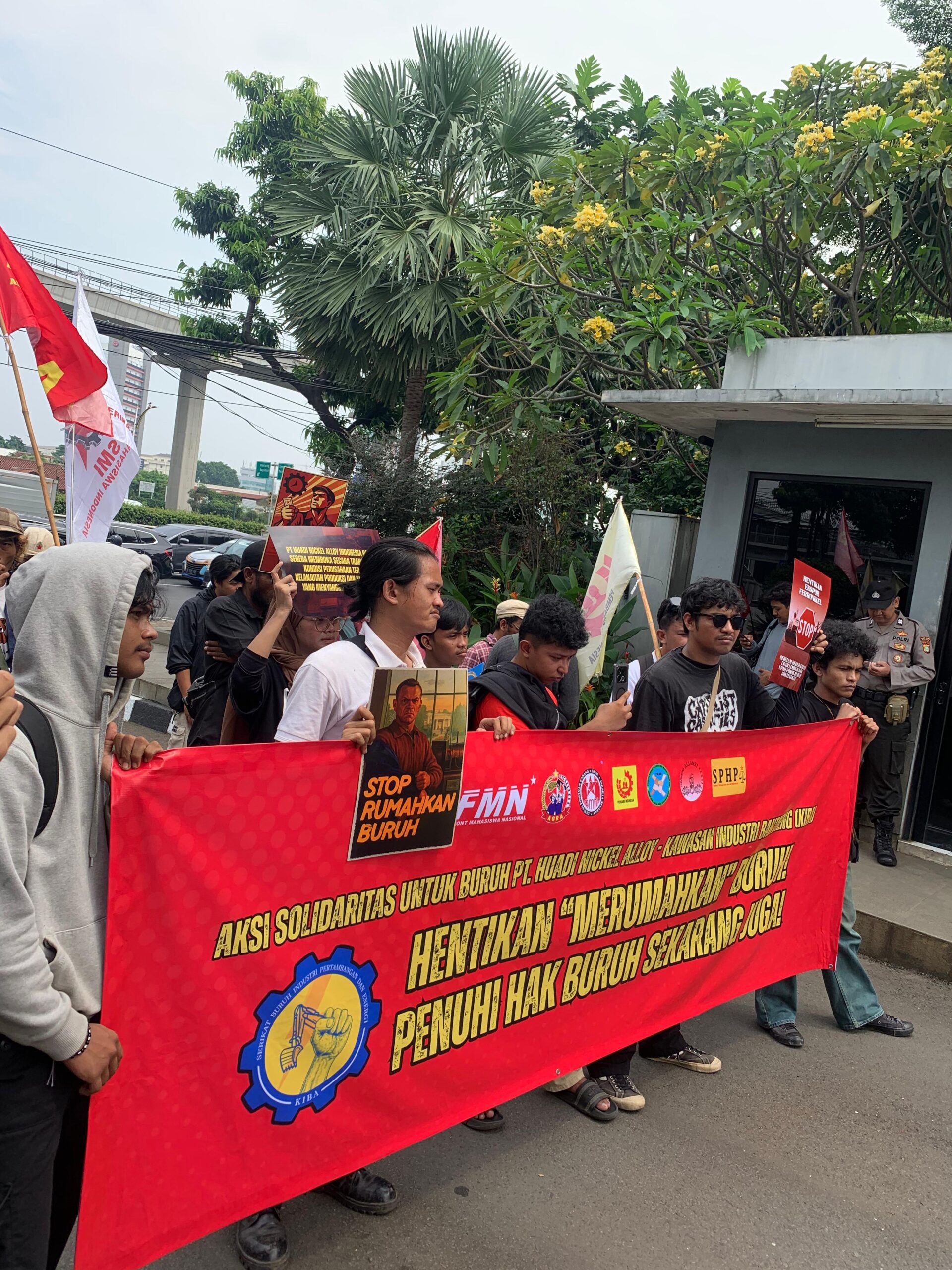 Aliansi Pergerakan Masyarakat menggeruduk Kementerian Ketenagakerjaan Republik Indonesia, Jakarta Selatan pada Senin (14/07). Aksi ini bertujuan untuk mendesak terpenuhinya hak-hak buruh, seperti jam kerja berlebihan, Pemutusan Hubungan Kerja (PHK) sepihak, serta upah tak layak oleh PT Huadi Nickel Alloy di Kawasan Industri Bantaeng (KIBA), Sulawesi Selatan. Terdapat tiga titik pelaksanaan aksi, yaitu KIBA, Makassar, dan Jakarta.