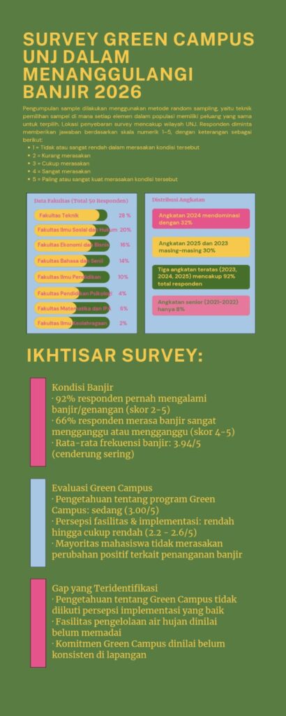 Untuk mengetahui sejauh mana komitmen UNJ sebagai green campus menangani banjir, LPM Didaktika mengadakan survei dengan total sampel 50 mahasiswa. Adapun metode pengumpulan sampel adalah random sampling. Responden diminta memberikan jawaban skala numerik satu sampai lima. Semakin tinggi nilai yang dipilih, maka narasumber kian mengiyakan pertanyaan dalam survei.