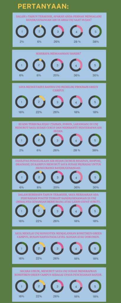 Dalam survei mengenai green campus di UNJ, rata-rata skor untuk indikator ruang terbuka hijau yang membantu penyerapan air hanya mencapai 2,32. Selain itu, skor untuk fasilitas pengelolaan air hujan adalah 2,20. Sementara itu, persepsi terhadap perubahan positif terkait banjir bernilai 2,46.