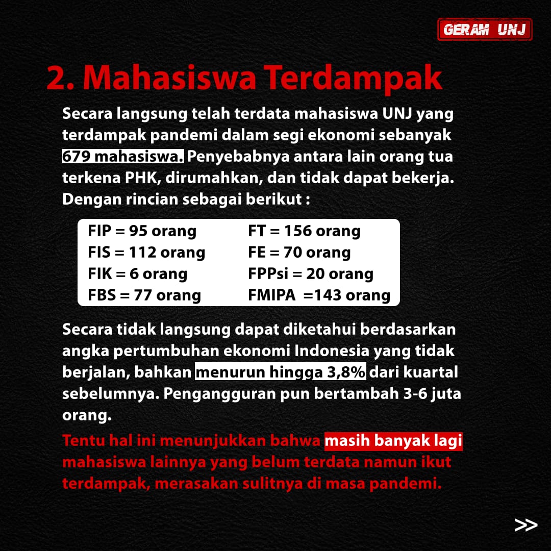 Data hasil kajian GERAM UNJ mengenai instrumen KHL (Kajian Hidup Layak) UNJ, sebanyak 679 mahasiswa terdampak pandemi. Bahkan, 75,9% mahasiswa menyatakan kesulitan untuk membayar UKT di semester 113 karena berbagai hal.